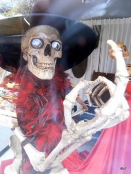 Un stand au coin d’une de ses minuscules rues. Il est fermé. C’est normal. Il est habité de squelettes. Le stand est propre cependant et ses locataires sont bien tenus, même s’ils datent d’un siècle écoulé. Ils surgissent de ce décor maladroit et font la fête avec entrain. Regardez ce couple élégant qui tourne avec aisance et dignité. N’est-il pas racé ?