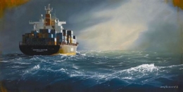 Le gigantisme s’affronte, d’un côté la brutalité de l’océan dont pourtant les vagues dentelières sont presque féminines et de l’autre la force brute du métal assemblé par l’humain.